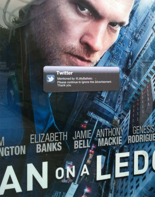 Enfin, il n’y a pas que Facebook qui inspire les street-artistes. Comme le montre la vidéo du festival GALORE en début d’article, Twitter est également source d’inspiration. Pour le colleur d’images Jilly Ballistic, c’est l’opportunité d’attirer l’attention du citoyen et d’aller contre le trop plein de publicité en faisant “court”, très court. Ci-dessous, il colle donc un tweet publié par lui-même, @JillyBallistic, avec pour simple message: “S’il vous plaît continuez à ignorer cette publicité. Merci.” Ce tweet collé restera affiché pendant plusieurs jours sur l’abribus M15 à St Allen & St Stanton, à New-York.